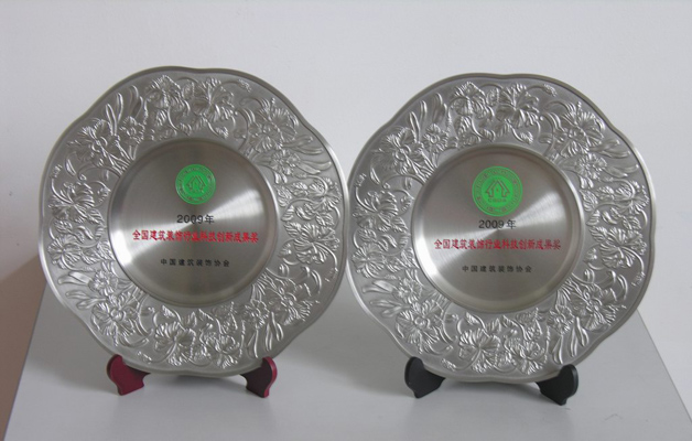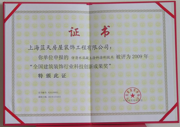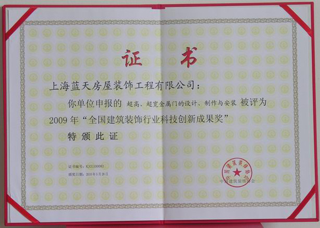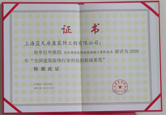2009年藍(lán)天公司的“無(wú)機(jī)預(yù)涂裝飾板現(xiàn)場(chǎng)施工裝配技術(shù)”、“仿清水混凝土涂料涂刷技術(shù)”、“超高、超寬金屬門的設(shè)計(jì)、制作與安裝”這三項(xiàng)技術(shù)被評(píng)為全國(guó)建筑裝飾行業(yè)科技創(chuàng)新成果獎(jiǎng)。