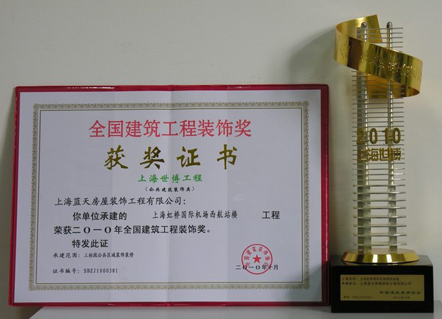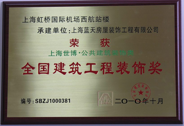 2010年10月,由藍天公司承建的上海虹橋國際機場西航站樓裝飾裝修工程榮獲上海世博·公共建筑裝飾類全國建筑工程裝飾獎和上海世博工程全國優秀設計獎。