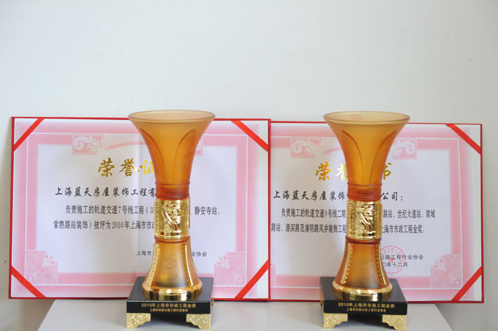藍天公司軌道交通9號線二期工程(12標楊高中路站、世紀大道站、商城路站、源深路及浦明路風井裝飾工程),軌道交通7號線工程(35-3標長壽路站、靜安寺站、常熟路站裝飾)被評為2010年上海市市政工程金獎。軌道交通7號線工程被中國市政工程協會評為2010年市政金杯示范工程。