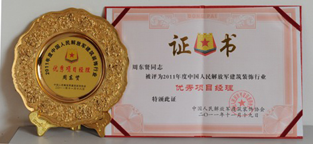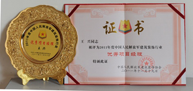 2011年11月,藍(lán)天公司郭夕山、周東賢、王興三位同志被評(píng)為2011年中國(guó)人民解放軍建筑裝飾行業(yè)優(yōu)秀項(xiàng)目經(jīng)理。