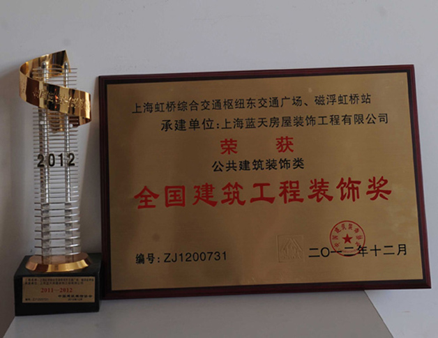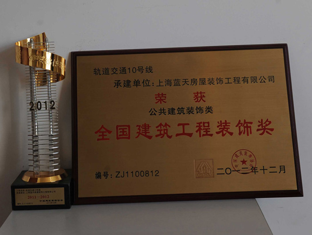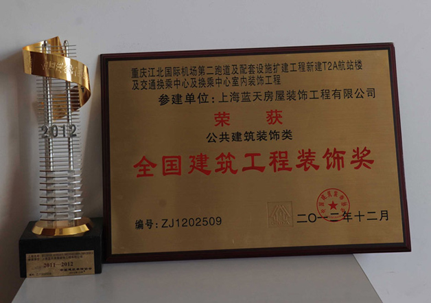 2012年12月,藍(lán)天公司捧回了4個(gè)全國(guó)建筑工程裝飾獎(jiǎng),分別是軌道交通10號(hào)線工程、杭州蕭山國(guó)際機(jī)場(chǎng)二期項(xiàng)目一階段國(guó)際航站樓工程、重慶江北國(guó)際機(jī)場(chǎng)第二跑道及配套設(shè)施擴(kuò)建工程新建T2A航站樓及交通換乘中心及換乘中心室內(nèi)裝飾工程、上海虹橋綜合交通樞紐東交通廣場(chǎng)、磁浮虹橋站工程。