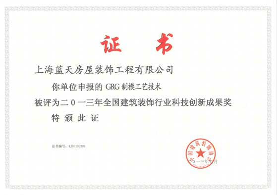 2013年7月,藍天公司GRG制模工藝技術被評為2013年“全國建筑裝飾行業科技創新成果獎”。