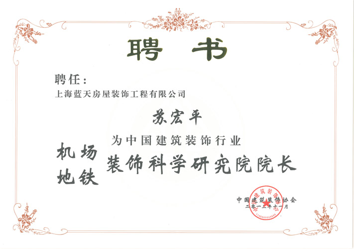 1、藍天公司被授予“中國建筑裝飾行業機場地鐵裝飾科學研究院”稱號,公司總經理蘇宏平被聘任為中國建筑裝飾行業機場地鐵裝飾科學研究院院長。