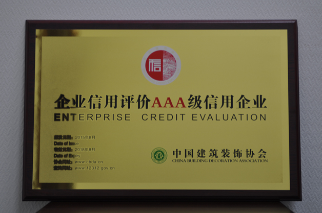 2015年由中國建筑裝飾協會對上海藍天房屋裝飾工程有限公司在2012年1月至2014年12月的信用狀況進行了評價,評定結果為AAA級。這是我司自2005年后連續4次獲得該評價。
