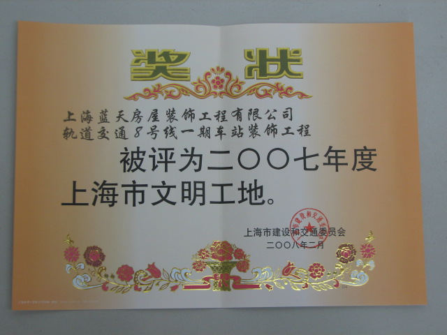 軌道交通8號線人民廣場站不僅2006、2007連續(xù)兩年被評為軌道交通“文明工地”,同時(shí)還連續(xù)兩年被評為上海市文明工地。項(xiàng)目經(jīng)理于觀平被評為上海市建設(shè)功臣。