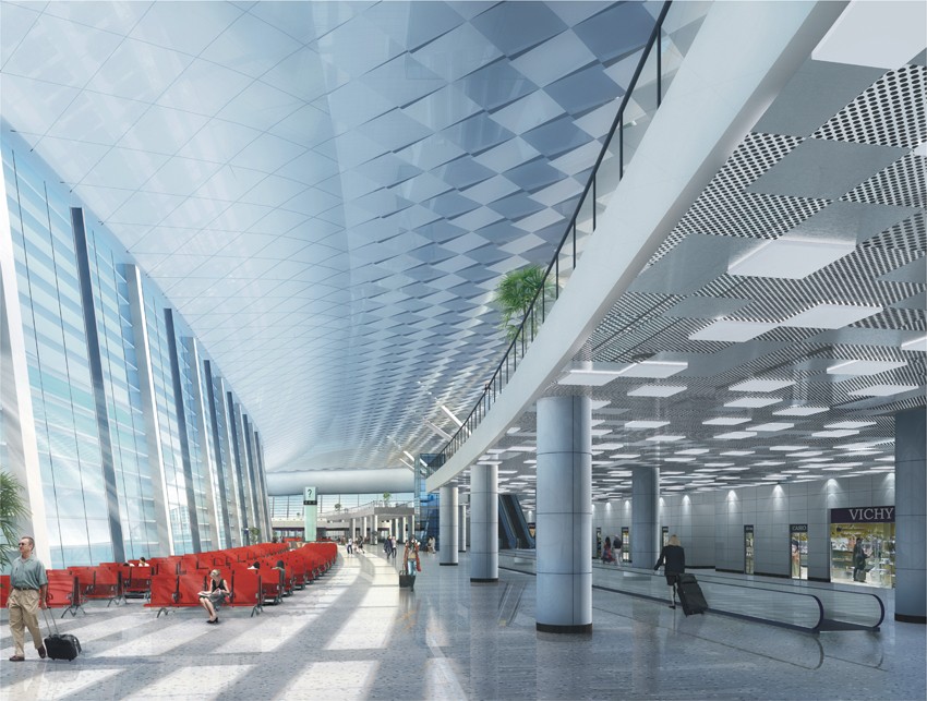 新鄭國際機場T2航站樓,建筑面積48.5萬平方米。我司參與主樓(約12萬平方米)大屋面天花的裝飾施工。